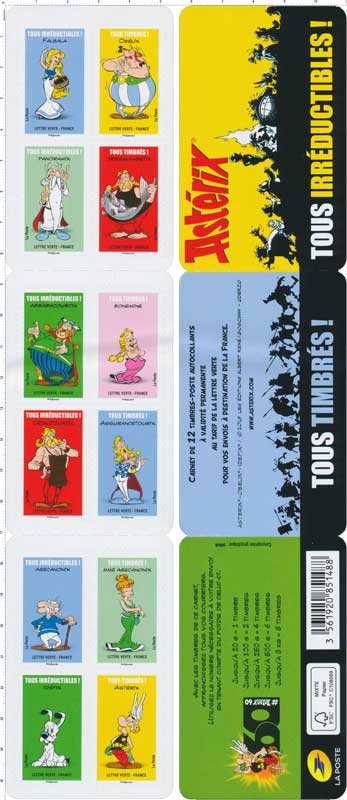 | Commentaire | Visuel de la couverture : volet droit : Titre "Astérix, tous irréductibles ! et scène du village gaulois. - volet central : Tous timbrés ! Le type de timbres L.V. et la destination France. - volet gauche : utilisation des timbres pour l'affranchissement, le code barre, le type de papier, La Poste. Les personnages représentés sur les TVP (ordre des TVP) : Falbala : fille de Plantaquatix et épouse de Tragicomix. / Obélix : livreur de menhirs, meilleur ami et compagnon d'aventures d'Astérix et d'Idéfix. / Panoramix : druide du village, détenteur du secret de la potion magique. / Ordralfabétix : poissonnier du village, et le manque de fraîcheur de ses poissons, cause régulièrement des bagarres. / Abraracourcix : chef du village, qui a le privilège d’être porté sur son bouclier par deux hommes plutôt maladroits. / Bonemine : épouse du chef du village, elle sait tenir tête, pour tenir sa place. / Cétautomatix : forgeron du village, empêche souvent le barde de chanter, se plaint du manque de fraîcheur des poissons et cherche constamment la bagarre. / Assurancetourix : barde du village, dont les habitants n'apprécient ni le chant, ni la musique. / Mr. et Mme Agécanonix : doyen du village, vieux, colérique et irascible, et sa jeune et belle femme. / Idéfix : chien d'Obélix, bénéficie d'une place important dans les épisodes. / Astérix : le héros de la série, est un petit blondinet rusé, à moustaches. En savoir plus sur Wikipédia : Astérix |