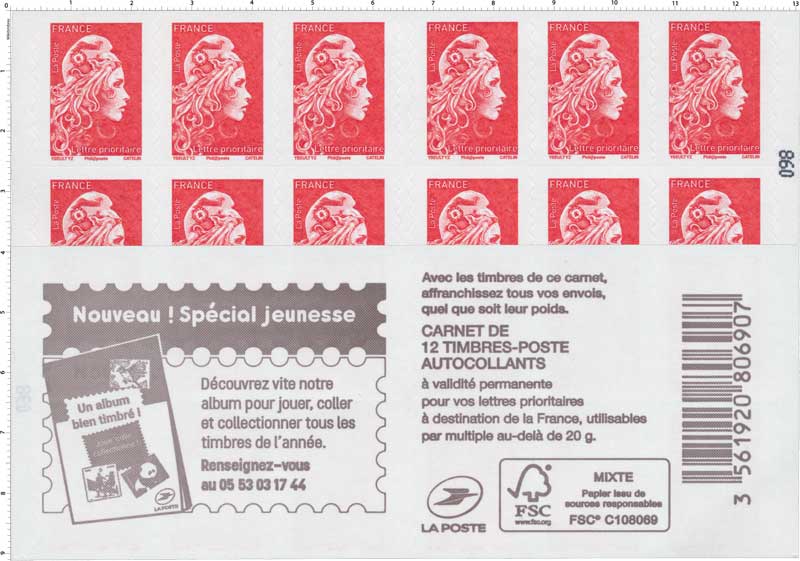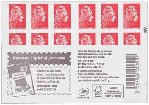| Description | Carnet de 12 timbres Marianne l'engagée - Rouge - Nouveau ! Spécial jeunesse |