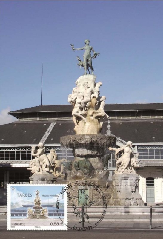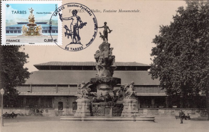 | Commentaire | Description de la fontaine : l'Aurore (Escoula) avec à ses côtés un isard bondissant. En-dessous la partie "les Torrents" (Desca) : les personnages représentent l'Adour, l'Echez, le Gave, l'Arros, la Neste et le Bastan. Trois animaux des Pyrénées se blottissent sous les vasques : l'ours, le loup et l'aigle. Aux angles du bassin se trouvent 4 sculptures : les plaines d'Argelès (la femme protège un jeune taureau et un agneau, reposant sur les armes de Lourdes - Mathet) et de Tarbes (cheval et fabrication d'armes- Mathet) et les vallées d'Aure (femme, bouc et blasonnement - Mathet) et de Bagnères (femme, chien et lyre - Escoula). - la Halle Marcadieu : un premier projet de halle abritant le marché est envisagé dès 1836, mais ce n'est qu'en 1880 que la municipalité décide cette construction. Le choix est fait le 25 mars 1880, le projet "Verax" de l'entreprise Joret et Cie, ingénieurs-constructeurs à Paris est retenu. Les travaux se déroulent de 1880 à 1882, la réception définitive par Louis Caddau, architecte de la ville, ayant lieu en 1884. Elévation d'une halle monumentale, à nef unique ouverte sur les quatre façades, ces entrées marquant l'axe des rues et carrefours de la place Marcadieu. Portée par de grandes fermes sans appui intermédiaire, elle ménage un vaste espace intérieur très lumineux (Long. 83,50 m x larg. 51,50 m x 18,50 m de hauteur maximale - 4 300 m⊃2; couverts - carreau central de 66 m x 34 m, d'un seul tenant. À l'extérieur, une marquise de 3 m de large et 5,50 m de haut court tout autour de l'édifice ; elle souligne l'étagement des différents niveaux de toitures. Des travaux de réfection de la toiture interviendront en 1934, et la rénovation intégrale en 2003. Arrière plan : la chaîne des Pyrénées, avec le Pic du Midi de Bigorre (2 876 m), le pic de Néouvielle (3 091 m), le Vignemale (3 298 m) et le mont-Perdu (3 355 m) sur la frontière espagnole le col du Tourmalet (tour de France), le cirque de Gavarnie (1 570 m, cirque naturel de type glacière) - les villes de Lourdes, Bagnères-de-Bigorre, Cauterets, Luz-St-Sauveur, St-Lary-Soulan… En savoir plus sur Wikipédia : Tarbes
