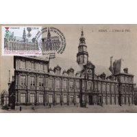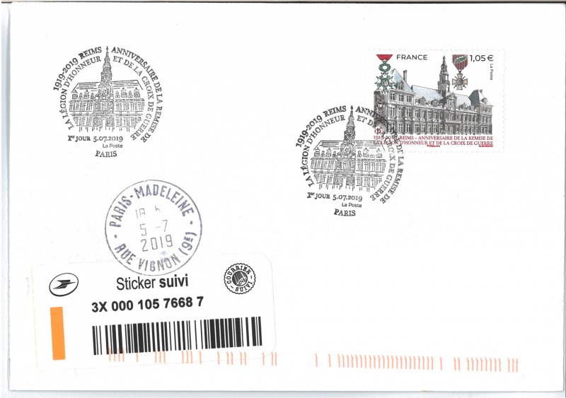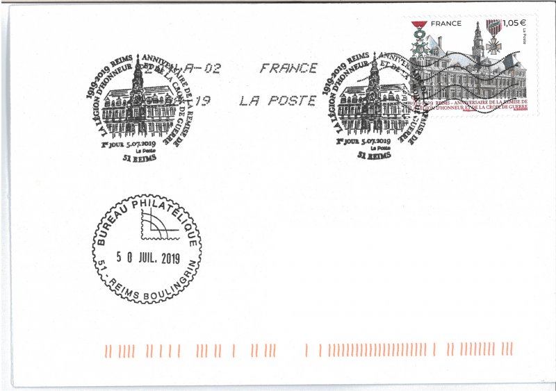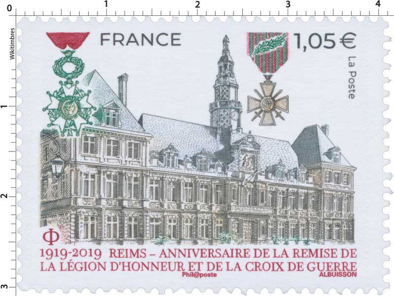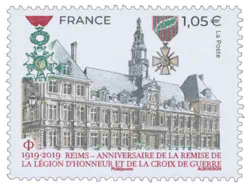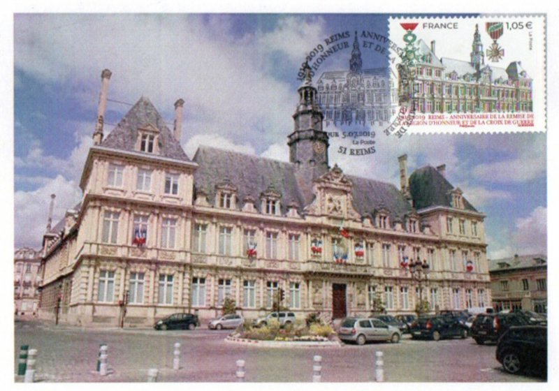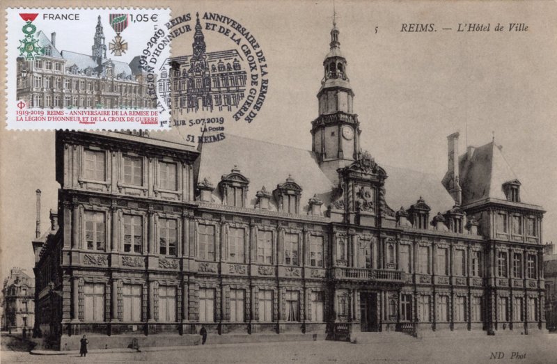 | Commentaire | Représentation de l'Hôtel de ville de Reims Le 6 juillet 1919, "au nom de la France reconnaissante", le président de la République, Raymond Poincaré (président de fév.1913 à fév.1920), remet solennellement la Légion d’Honneur et la Croix de guerre à la ville de Reims. Le même jour, la même décoration est attribuée au drapeau de la compagnie des sapeurs-pompiers de Reims, distingués pour leur bravoure. Citation : "Ville martyre qui a payé de sa destruction la rage d’un ennemi impuissant à s’y maintenir. Population sublime qui, à l’image d’une municipalité modèle de dévouement et de mépris du danger, a montré le courage le plus magnifique en restant pendant plus de trois ans sous la menace constante des coups de l’ennemi et en ne quittant ses foyers que sur ordre. A montré dans l’avenir de la France une foi profonde, à l’exemple de l’héroïque Française vénérée à Reims, dont la statue s’élève au cœur de la ville. (Croix de guerre)". C'est Georges Clemenceau (sept.1841-nov.1929), président du Conseil (1906 à 1909 et 1917 à 1920), qui prit la décision d’accorder ces prestigieuses décorations aux villes martyres. Le décret d’attribution pour la ville de Reims, signé le 4 juillet, Jean-Baptiste Langlet (médecin, député et maire de Reims de 1908 à 1919, durant la période de sept. 1914 à la fin de la guerre, l'agglomération Rémoise est sur la ligne de front et sous le feu des canons allemands) annonçait par voie d’affiche la remise de la Légion d’honneur par le président Poincaré pour le 6 juillet 1919. En savoir plus sur Wikipédia : Hôtel de ville de Reims En savoir plus sur Wikipédia : Reims |
