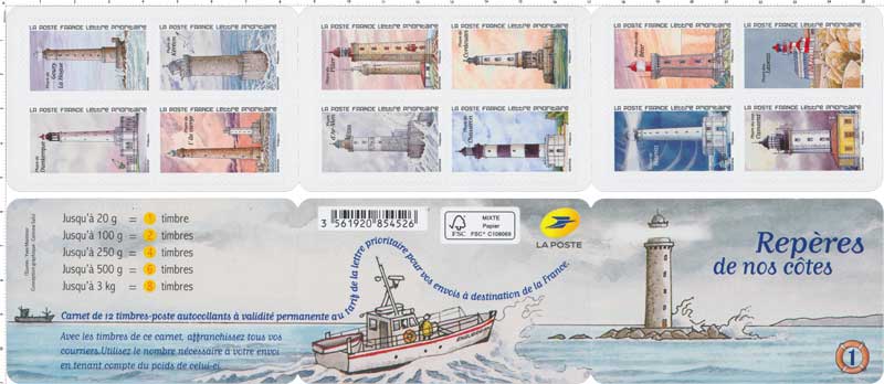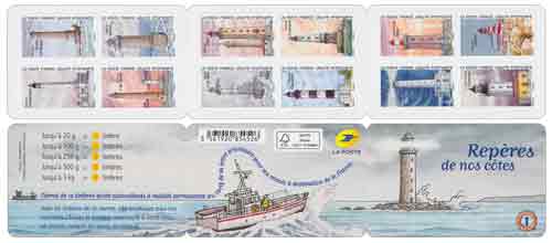 | Description | Série repère de nos côtes N°1 : Carnet de 12 timbres-poste autocollants illustrés par des phares. |