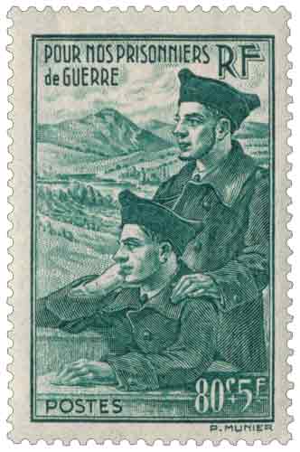 | Commentaire | Pour nos prisonniers de guerre Émis le 1er janvier 1941 sous le régime de Vichy pour soutenir les près de deux millions de soldats français captifs en Allemagne après la débâcle de 1940, ce timbre semi-postal de valeur faciale 80 centimes plus surtaxe de 5 francs correspondant au tarif de la carte postale intérieure représente deux prisonniers de guerre qui regardent l'horizon, symbole de solidarité nationale en période d'occupation. Dessiné et gravé par Pierre Munier, il est imprimé en taille-douce rotative en vert sur feuilles de 25 exemplaires, avec dentelure 13 et format de 21,45 × 36 mm pour la vignette, formant une paire indissociable avec la valeur complémentaire de 1 franc plus 5 francs retirée de la vente en août 1941. |