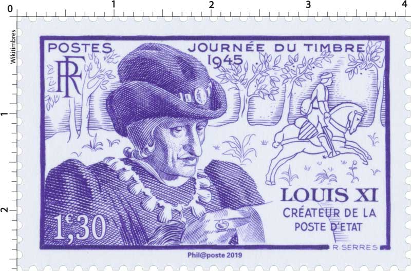 | Commentaire | Visuel : Louis XI, créateur de la Poste d´Etat et un "chevaucheur" transportant le courrier. En 1479, il crée la charge de "contrôleur général des chevaucheurs", c'est-à-dire responsable de la poste, le premier système régulier de relais sur les grandes routes de France.