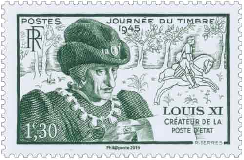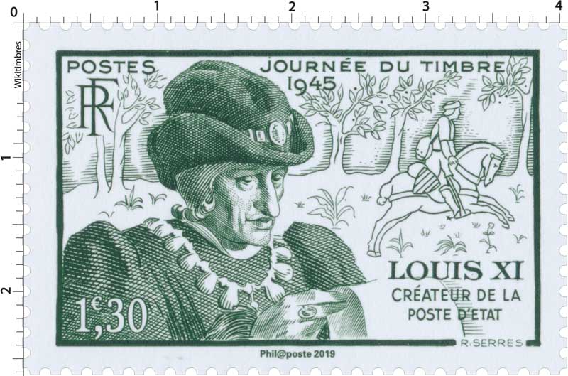 | Commentaire | Visuel : Louis XI, créateur de la Poste d´Etat et un "chevaucheur" transportant le courrier. En 1479, il crée la charge de "contrôleur général des chevaucheurs", c'est-à-dire responsable de la poste, le premier système régulier de relais sur les grandes routes de France.