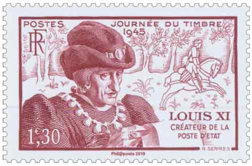 | Commentaire | Visuel : Louis XI, créateur de la Poste d´Etat et un "chevaucheur" transportant le courrier. En 1479, il crée la charge de "contrôleur général des chevaucheurs", c'est-à-dire responsable de la poste, le premier système régulier de relais sur les grandes routes de France.