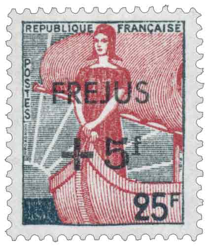 | Commentaire | Surchargé Émis par la France en 1959 à la suite de la catastrophe du barrage de Malpasset, ce timbre-poste surtaxé de 25 francs + 5 francs, issu du type d’usage courant « Marianne à la nef », a été mis en circulation afin de permettre au public de venir en aide aux sinistrés de Fréjus après la rupture dramatique du barrage survenue dans la nuit du 2 décembre 1959. Réutilisant un modèle existant dessiné par André Regagnon et gravé par Jules Piel, l’administration postale a choisi la solution rapide d’une surcharge « Fréjus + 5 F », la surtaxe étant intégralement destinée aux victimes, illustrant ainsi le rôle immédiat et concret du timbre comme instrument de solidarité nationale. La mise en vente générale intervient le 15 décembre 1959, quelques jours seulement après la catastrophe, et l’émission est retirée très rapidement, ce qui confère à ce timbre une place particulière parmi les émissions caritatives françaises. Destiné principalement à l’affranchissement de la lettre intérieure jusqu’à 20 grammes, ainsi qu’à certains imprimés et envois spécifiques, ce timbre combine une fonction postale usuelle et un message d’assistance, même si le contraste entre l’image paisible de la Marianne batelière et la violence des flots libérés par la rupture du barrage de Malpasset a été relevé par la critique contemporaine. Cette émission témoigne néanmoins de la capacité de la philatélie française à réagir à l’actualité tragique et à inscrire un événement majeur de l’histoire nationale dans le support quotidien du courrier. |