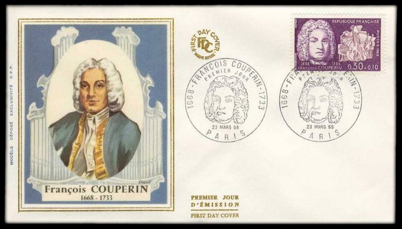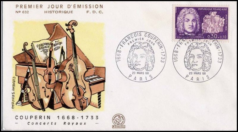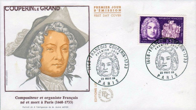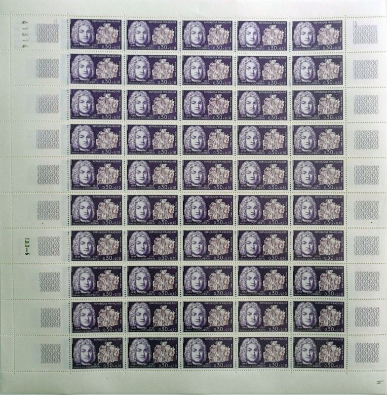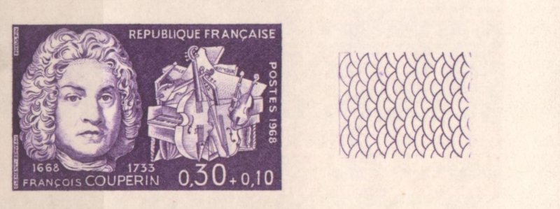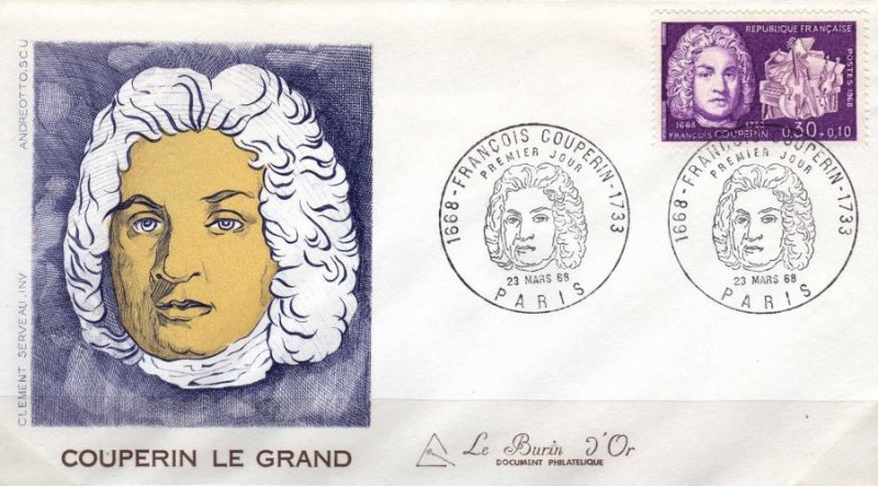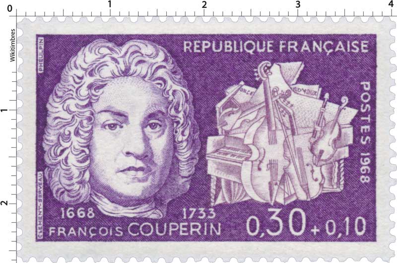 | Commentaire | En savoir plus sur Wikipédia : François Couperin Célèbre compositeur français, organiste et joueur de clavecin. C'est en 1968 que la série des personnages célébres est modifiée. Le second plan est détaché du personnage, le rendant ainsi plus lisible.Le personnage est maintenant représenté sous forme de portrait et non d'un buste accompagné d'une oeuvre ou d'une synthése des oeuvres du personnage. La surtaxe est reversée au bénéfice de la Croix-Rouge française. Il y a des musiciens dont le nom évoque immédiatement une époque, une atmosphère, un raffinement... Couperin, c’est exactement ça. Et pas n’importe lequel : François Couperin, dit “le Grand” – rien que ça. Un surnom mérité, promis. Né à Paris en 1668, dans une famille déjà bien installée dans le monde de la musique (c’est un peu comme être né dans une dynastie de pizzaiolos napolitains : t’as pas trop le choix), il hérite très tôt de la charge d’organiste à Saint-Gervais. À onze ans, il perd son père. Sa mère, plutôt que de le voir finir apprenti charcutier, s’endette pour lui payer les meilleurs profs. Et bingo : il devient un vrai prodige du clavier. Dès qu’il touche à un orgue ou un clavecin, ça devient du velours. Il compose des messes, des sonates, des motets... puis se retrouve dans les petits papiers du roi. Prof de musique des nobles, chouchou des salons, il joue à la Cour, dédie ses œuvres à tout le bottin mondain. Un peu comme si ton prof de piano donnait des cours à Beyoncé et sortait des albums en édition collector. Mais tout ne dure pas. Après la mort de Louis XIV, les goûts changent. Couperin, discret, pas très doué pour les intrigues de palais, se fait éclipser. Il continue pourtant à écrire, encore et encore. Jusqu’à sa mort en 1733, quasiment dans l’ombre. Et pourtant... quelle œuvre ! Plus de deux cents pièces pour clavecin, un traité théorique (L’Art de toucher le clavecin), des recueils de concerts, des “apothéoses” musicales qui rendent hommage à Lully ou Corelli. Un monde tout en nuances, entre malice et mélancolie. Pendant longtemps, il a été un peu oublié. Mais il revient. Et quand tu écoutes ses pièces aujourd’hui, tu sens encore battre le cœur feutré d’un Versailles en clair-obscur. WikiTimbres |