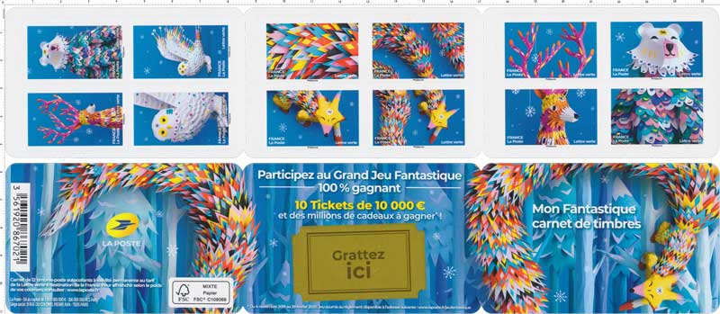 | Commentaire | Visuel de la couverture : volet droit : Titre et renard avec sa longue queue en papier multicolor volet central : grattage du numéro du Grand Jeu Fantastique volet gauche : l'utilisation des timbres pour l'affranchissement, le type de papier, le code barre, La Poste. Lila POPPINS est née au printemps 1991, saison qui deviendra le fil rouge de son imaginaire en grandissant. Elle décide de mettre ses études au service de son univers coloré et rocambolesque, pour donner vie à toutes ses idées, et se tourne vers le cinéma d'animation. Elle intègre l'EMCA (école des métiers du cinéma d'animation) d'Angoulême en 2013, et en sort diplômée la même année. C'est durant cette année qu'elle se penche sur cet art qui devient son grand amour : le papier découpé. Lila s'installe à Paris et devient réalisatrice de films animés, mixant papier découpé et animation volume (stop-motion). Elle s'épanouit aussi dans d'autres domaines comme celui de l'illustration qu'elle touche en photographiant ses créations mises en scène, mais aussi dans ceux du pop up, de la décoration de vitrines ou d’événements, ou des objets unique. Armée de ciseaux, de patience, de créativité et d'originalité, Lila vous emportera dans son univers enjoué exotique et spatiale, au travers de bon nombre de réalisations, qu'elles soient en volume, ciselées à plat, fixes, ou animées tant qu'elles utilisent ce matériau noble qu'est le papier. |