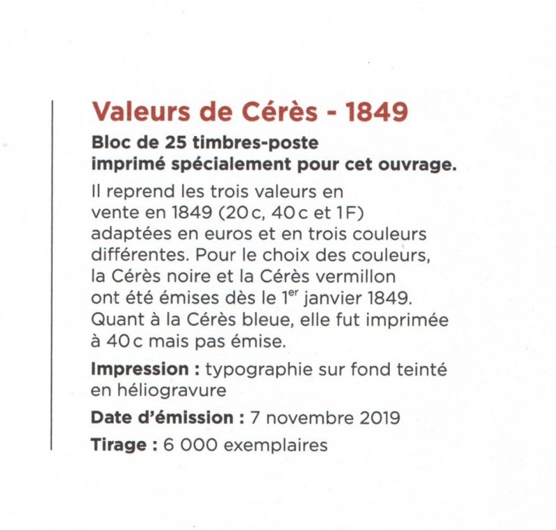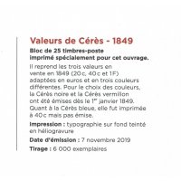 | Description | Livre de 60 pages dans lequel est inséré un bloc de 25 timbres Cérès avec trois valeurs 0,20 € 0,40 € et 1€. |