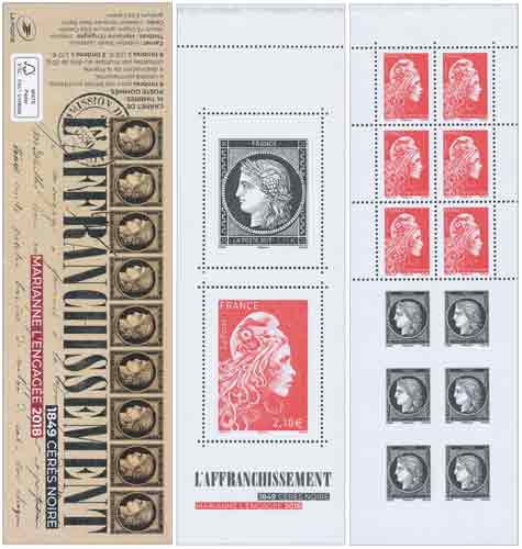 | Commentaire | Visuel : carnet gommé de la série timbre courant : "Cérès" et "Marianne l’engagée" avec une couverture cartonnée et imprimée + un feuillet avec 1 timbre "Cérès" à 2,10 € noir et 1 timbre "Marianne l'engagée 2018" à 2,10 € rouge - en grand format. et un feuillet avec 6 timbres "Marianne l'engagée 2018" au tarif Lettre Prioritaire et 6 timbres "Cérès" à 1,05 € noir . |
