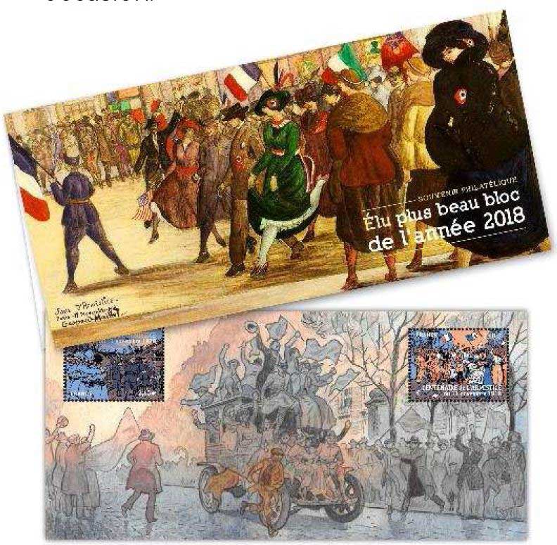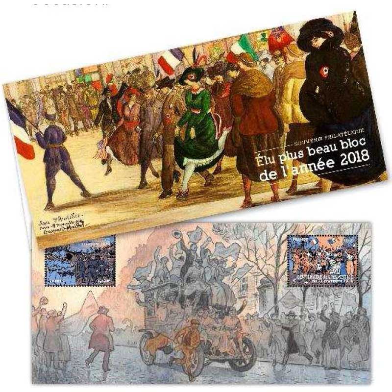 | Commentaire | Lors de l'élection du timbre, le bloc de timbres "Centenaire de l'armistice du 11 novembre 1918" a été primé plus beau bloc de l'année 2018. Un souvenir philatélique avec un dessin de Damien Cuvillier sur le feuillet, est émis à cette occasion. Visuel : couverture : oeuvre de Gaspard MAILLOL © Gianni Dagli Orti. Feuillet : création de Damien CUVILLIER d'après photo Keystone France/Gamma Rapho. via Getty Images. Des Parisiens se précipitent sur une voiture pour répandre la nouvelle de la défaite des armées allemandes et de l'armistice le 11 novembre 1918 à Paris, France. |