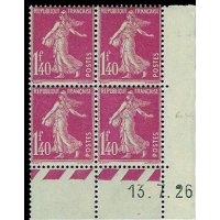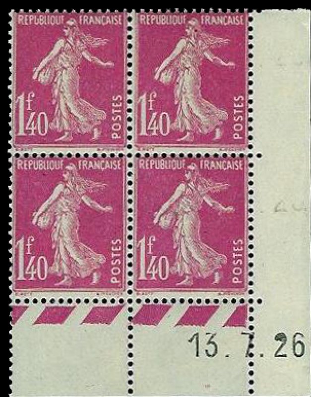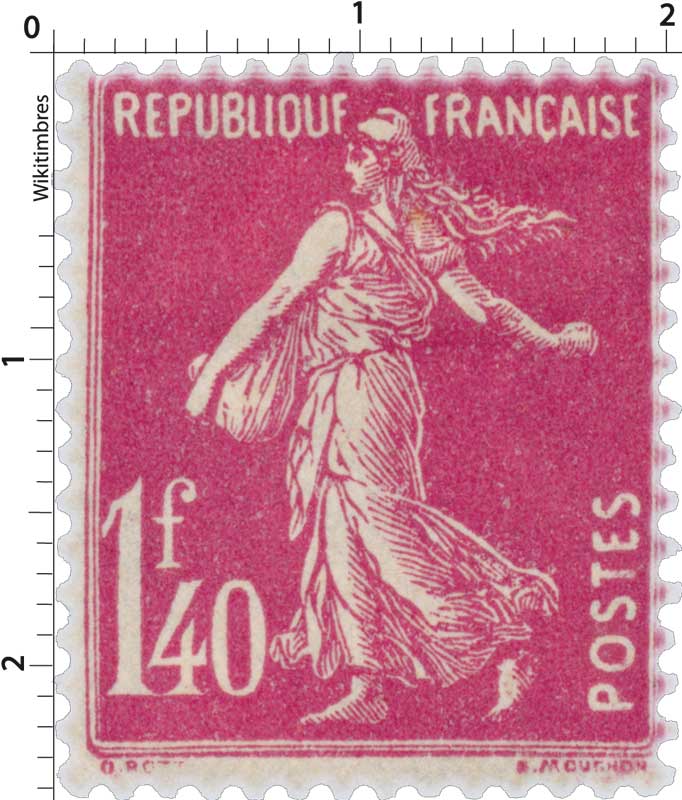 | Commentaire | Semeuse camée. Voir la vidéo "Histoires de timbres" En savoir plus sur Wikipédia : semeuse camée Émis le 6 août 1926 et très rapidement retiré en septembre 1926, le 1f40 rose figure parmi les dernières hautes valeurs du type Semeuse fond plein à inscriptions grasses. Sa courte période de vente en fait une émission recherchée et typique des ajustements tarifaires de l’époque.