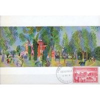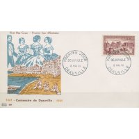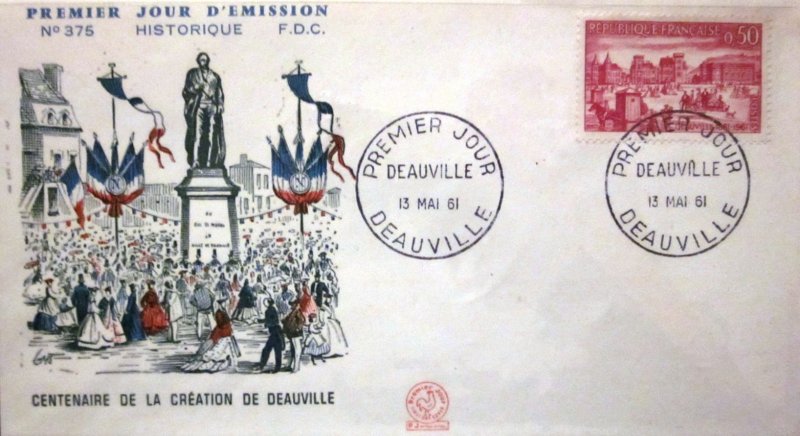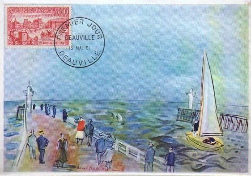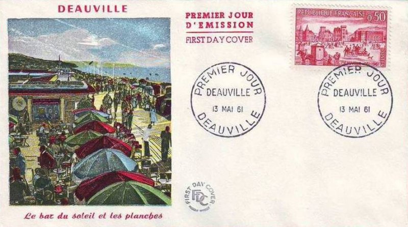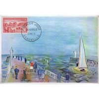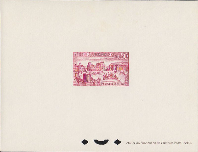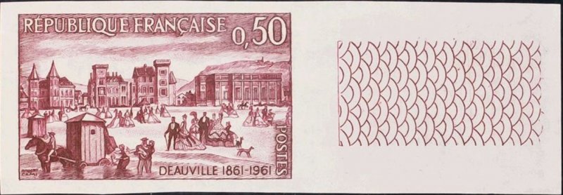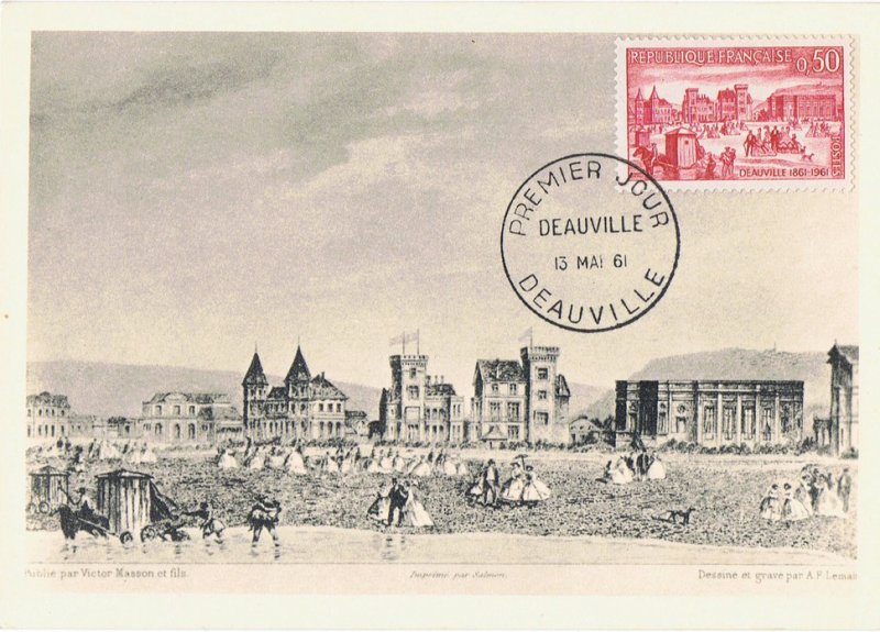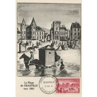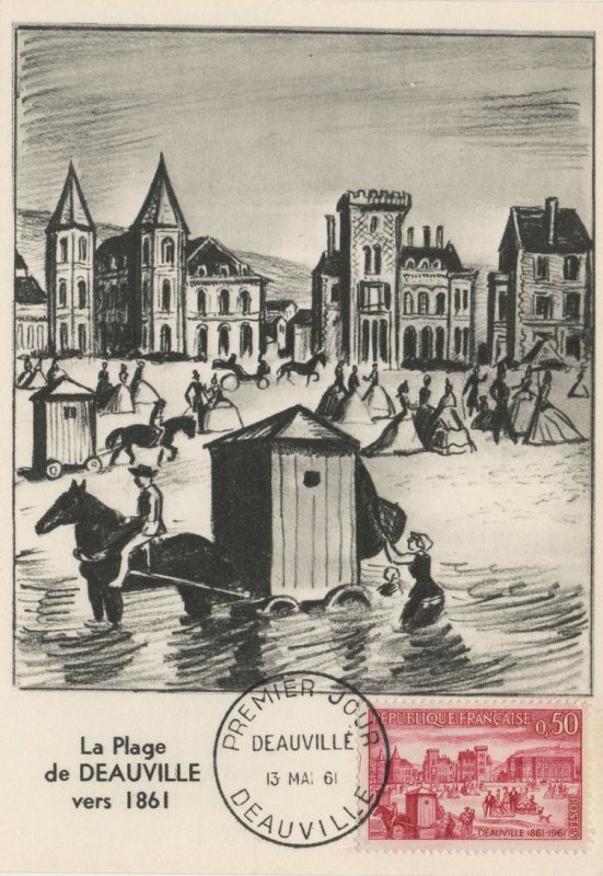 | Commentaire | Voir la vidéo "Histoires de timbres" Visuel : lors de l'édification de la ville balnéaire, la plage et le premier rang de villas (1860-1864) doivent être en recul de 10 m, avec la création de "La Terrasse", une digue-promenade longue de 1 800 m et large de 20. A cette époque, les cabines sur roues étaient tractées à l'aide d'un cheval jusqu'au lieu de baignade. Un contraste important avec les cabanes en bois datant de 1823/24. |