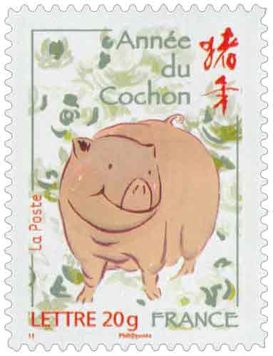 | Commentaire | De l’année du rat à l’année du cochon, le système astrologique oriental comprend douze signes animaux. Le cycle du zodiaque chinois se renouvelle ainsi tous les douze ans, le signe du cochon étant le dernier. Timbre sans millésime |