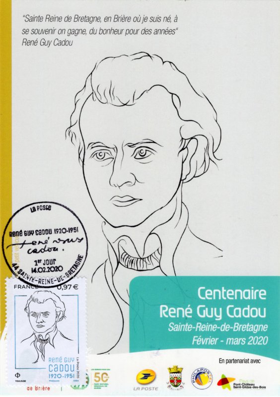 | Commentaire | Visuel : reprise du visuel d'une carte illustrée avec texte, sur l'écrivain-poète 0/5 René Guy CADOU, par l'illustrateur Roger TOULOUSE - aux Editions Le Bihan. / portrait © Adago, Paris 2020 - Bibliothèque Nationale, Paris / Bridgeman Images. Roger Alphonse Robert TOULOUSE, est né le 19 fév.1918 à Orléans (45-Loiret) où il décède le 11 sept.1994. C'est un peintre, sculpteur, poète et illustrateur. Ami des poètes, il n'hésitait jamais à mettre son talent à leur service. C'est ainsi que l'on retrouve ses dessins dans des revues, sur de nombreuses pages de garde, et qu'il participa à l'illustration de recueils pour Max Jacob (1876-1944, peintre, illustrateur, poète, romancier, journaliste, critique et essayiste) et pour les poètes de l’École de Rochefort-sur-Loire (49-Maine-et-Loire) qu'il avait rejoint en 1941. C’est à Rochefort-sur-Loire (49-Maine-et-Loire), dans l’arrière boutique de la pharmacie de Jean Bouhier En savoir plus sur Wikipédia : René Guy Cadou |