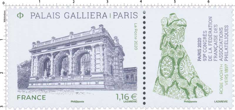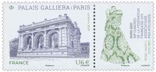 | Commentaire | Visuel - TP : Façade Sud du Palais Galliera - musée de la mode de la ville de Paris situé dans le palais de la duchesse de Galliera dans le 16e arrondissement. Vignette : Worth, robe d’intérieur ou tea-gown, vers 1897. Velours ciselé bleu foncé sur fond de satin vert, dentelle de Valenciennes. En savoir plus sur Wikipédia : Palais Galliera, musée de la Mode de la ville de Paris Format du timbre 40 x 30 mm avec vignette attenante 26 x 30 mm |