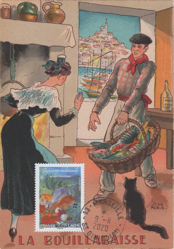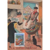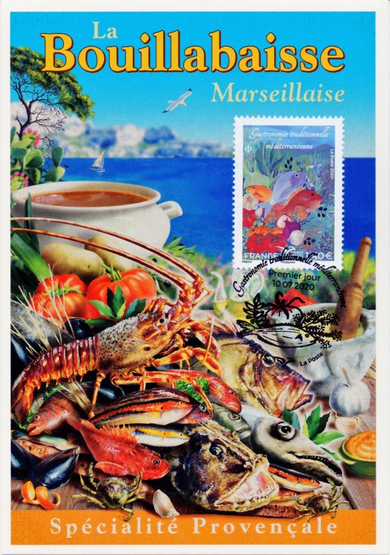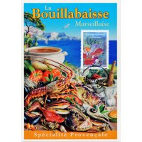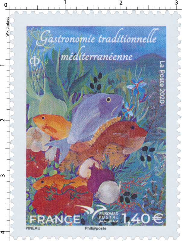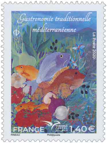 | Commentaire | L’Union EUROMed Postal a été établie à Rome, le 15 mars 2011, par 14 opérateurs postaux issus de la région méditerranéenne sous l'égide de l'Union Postale Universelle. Elle regroupe 21 pays en 2019. EUROMed Postal lance à partir du 8 juillet 2019, son premier Concours Philatélique du plus beau timbre EUROMed Postal de l’année. EUROMed Postal effectuent une émission annuelle sur un sujet commun. Après la "Conférence Euromed Postal" (2009) ; les "Poissons de Méditerranée" (2016) ; les "Arbres de Méditerranée" (2017), les "maisons de Méditerranée" (2018) et les "Costumes de Méditerranée" (2019) ; c’est la "Gastronomie traditionnelle méditerranéenne" qui a été retenue. La cuisine de la Provence méditerranéenne est avant tout une cuisine liée aux produits de la pêche (maritime ou fluviale), de l'élevage (viande des troupeaux ovin ou bovin) et du terroir (blé, riz, huile, vin). La gastronomie maritime de la Méditerranée française, est surtout un plat traditionnel marseillais…c'est la vraie "Bouillabaisse". C'est un ragoût, cuit dans l'eau ou du vin blanc, relevé d'ail, d'huile d'olive ou encore de safran, est servi en deux temps : la soupe d’abord et les poissons ensuite. La soupe de poissons se mange avec des croûtons de pains aillés, tartinés de rouille, mouillés d'huile d'olive et de pommes de terre bouillies. |