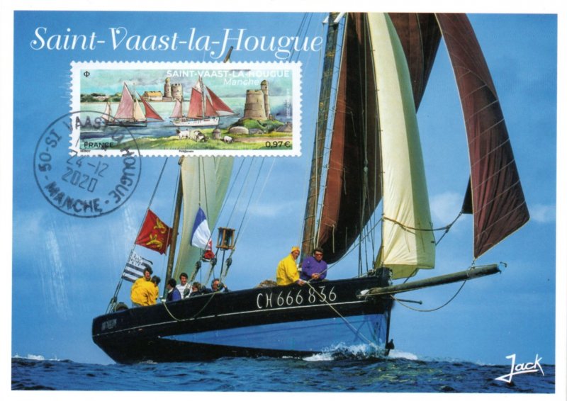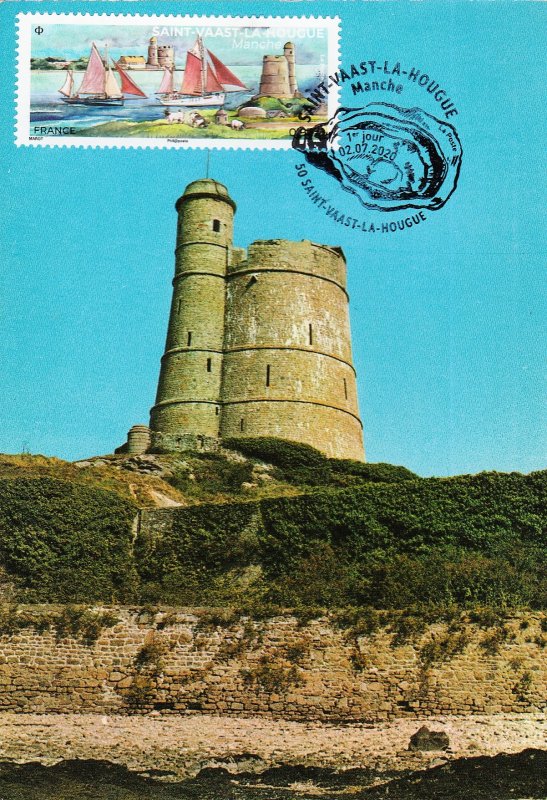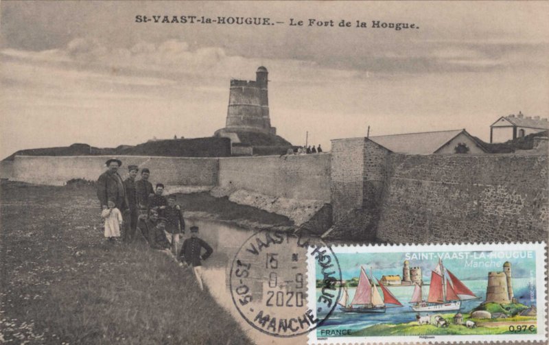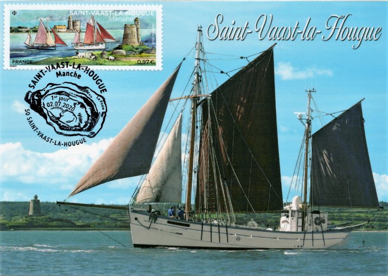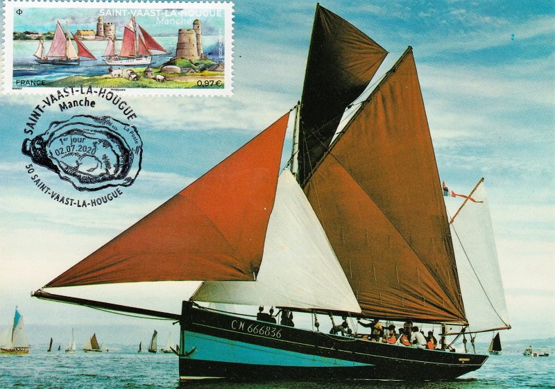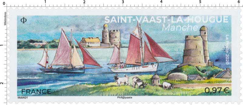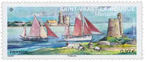 | Commentaire | Visuel : les deux Tours construites d'après les plans de Vauban : l'une sur l’île Tatihou (1694/99), l’autre sur le site de la Hougue (1694), pour protéger le village des belligérants et deux vieux gréements : le palangrier de pêche du type cotre à tapecul "Marie-Madeleine", construit à Saint-Vaast en 1934, et le dundée breton "Fleur de Lampaul", bateau à voile pour la pêche au hareng, construit à Camaret (29-Finistère) en 1947/48, tous deux classés monuments historiques et patrimoine mondial de l'Unesco depuis juillet 2008. Saint-Vaast-la-Hougue (50-Manche), dans la région Normandie, a été élu "Village préféré des Français" le 26 juin 2019, lors de l’émission de France 3 (conçue et produite par Morgane Production) présentée par Stéphane Bern. Le 1er juillet, à 21h, l'animateur du Patrimoine annoncera le "Village préféré des Français 2020", parmi 14 concurrents. Saint-Vaast-la-Hougue est un petit port du littoral s’avançant dans la mer comme une proue de navire, sur la côte Est de la presqu’île du Cotentin. Chargé d’un passé historique mouvementé, ce port de pêche et de plaisance est également une station balnéaire réputée. Berceau de l’huître Normande, la petite cité est parée de ses deux tours Vauban, joyaux du Patrimoine Mondial de l’Unesco. Au large de la petite ville portuaire, est situé un petit bout de terre, l'île Tatihou (site ornithologique) est dominée par la silhouette massive de la Tour Vauban, sentinelle de pierres et joyau de l’architecture militaire côtière, édifiée sur les plans de l’ingénieur et architecte miliaire Sébastien Le Prestre, marquis de Vauban (1633-1707, architecte et ingénieur du Génie militaire, urbaniste, hydraulicien et essayiste, Maréchal de France, sous Louis XIV). La presqu’île de la Hougue agrémentée par la seconde Tour Vauban, perchée sur son promontoire rocheux, est reliée au centre-ville par une digue qui forme un isthme. Pour les annales de l’histoire maritime, la cité reste le théâtre de la célèbre bataille navale de Barfleur-La Hougue (29 mai 1692), durant la guerre de la Ligue d'Augsbourg (sept.1688 à sept.1697), opposant les vaisseaux de la flotte française à la coalition anglo-hollandaise. En savoir plus sur Wikipédia : Saint-Vaast-La-Hougue |