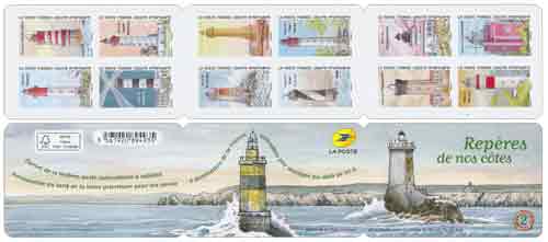 | Description | Série repère de nos côtes N°2 : Carnet de 12 timbres-poste autocollants illustrés par des phares. |