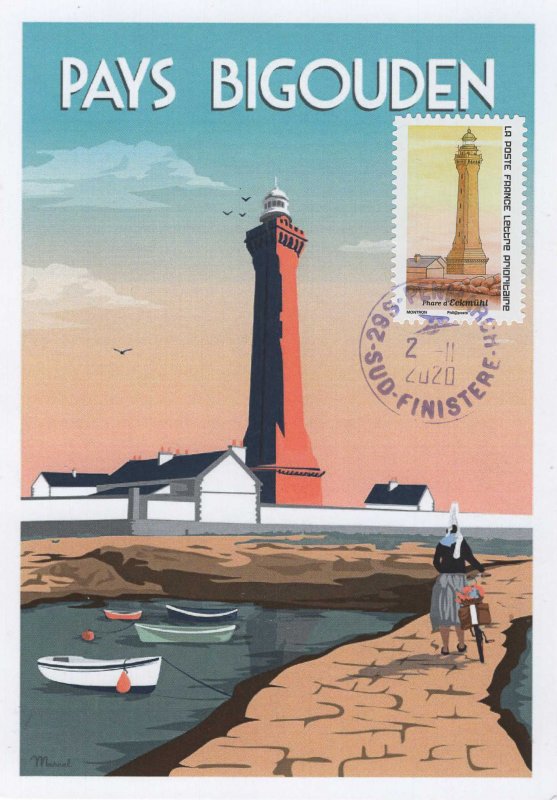| Commentaire | Phare d'Eckmühl (situé sur la pointe de Saint-Pierre à Penmarch - Finistère 29) - Le phare doit son nom à la marquise Adélaïde-Louise d'Eckmühl (1815-1892, femme de lettres et poétesse) la donatrice l'ayant financé en partie par un lègue en l'honneur de son père, le maréchal Davout, prince d'Eckmühl. Le site est composé d'un sémaphore de la Marine Nationale, de la "Tour à feu" et de la "chapelle Saint-Pierre" (XIVe siècle - 12m), du "Vieux phare" de 1835 (Centre de découverte maritime et expositions temporaires) et du Phare d'Eckmühl de 1897. En savoir plus sur Wikipédia : Phare d’Eckmühl |