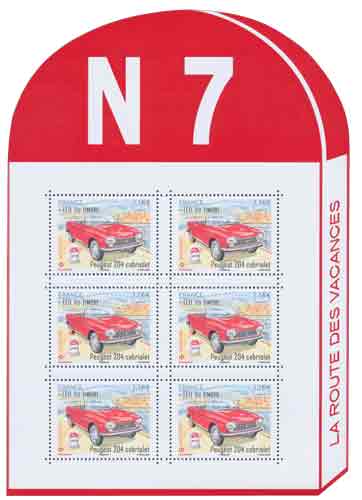 | Commentaire | Visuel : une Peugeot 204 cabriolet, sur la route mythique, permettant aux parisiens de se rendre par la N7 "la route des vacances", jusqu'à Menton, sur la côte d'Azur et ses plages ensoleillées. |