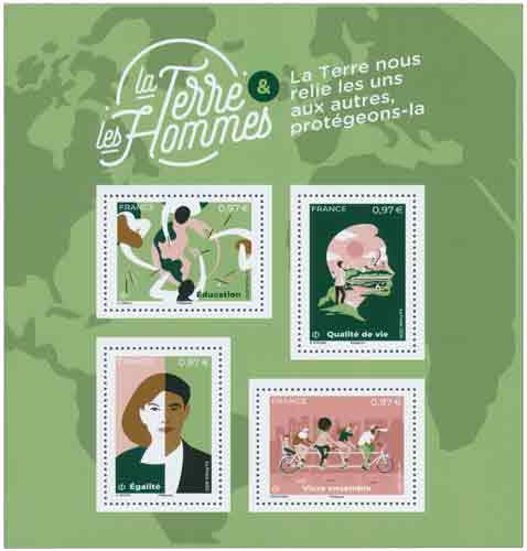 | Commentaire | Visuel : sur une carte terrestre représentant une partie des continents de notre Terre, les TP : Education + Qualité de vie + Egalité + Vivre ensemble, nous relient les uns aux autres pour nous aider à protéger notre planète bleue, afin de la léguer à nos descendants. Avec cette nouvelle série philatélique, La Poste souhaite témoigner de son engagement sociétal, et sensibiliser les humains au respect de la planète Terre qui nous nourrit, nous abrite, nous alimente en énergie et nous permet, tout simplement, de vivre ensemble. Du fait de son histoire et de son ancrage local, La Poste est un partenaire privilégié des territoires et des Hommes qui les peuplent. Elle agit tous les jours pour permettre à chacun de bien vivre en tout lieu, à la ville comme à la campagne. "Nous n'héritons pas de la terre de nos ancêtres, nous l'empruntons à nos enfants". Cette vision prophétique attribuée à l’écrivain Antoine de Saint-Exupéry (29 juin 1900 - 31 juil.1944, pilote, romancier, écrivain et journaliste) est un proverbe africain, cité dans "Terre des Hommes" (fév.1939, recueil d'essais autobiographiques). L'on peut trouver des expressions similaires dans une grande variété de peuplades, c’est une notion universelle, partagée par tous les peuples et qui s’est transmise de manière différente. "Traitez la terre, la nature et les animaux comme il se doit, elle ne vous a pas été donné par vos parents, elle vous a été prêté par vos enfants" (une phrase adaptée d'un proverbe autochtone). |