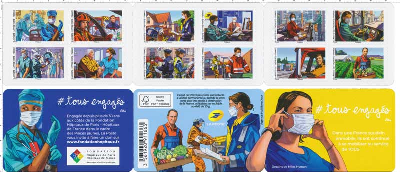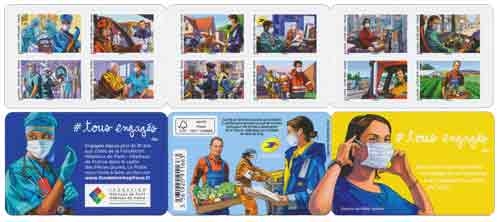 | Description | Émission d'un carnet de timbres "# tous engagés" remerciant et mettant à l’honneur les héros du quotidien pendant la crise sanitaire |
