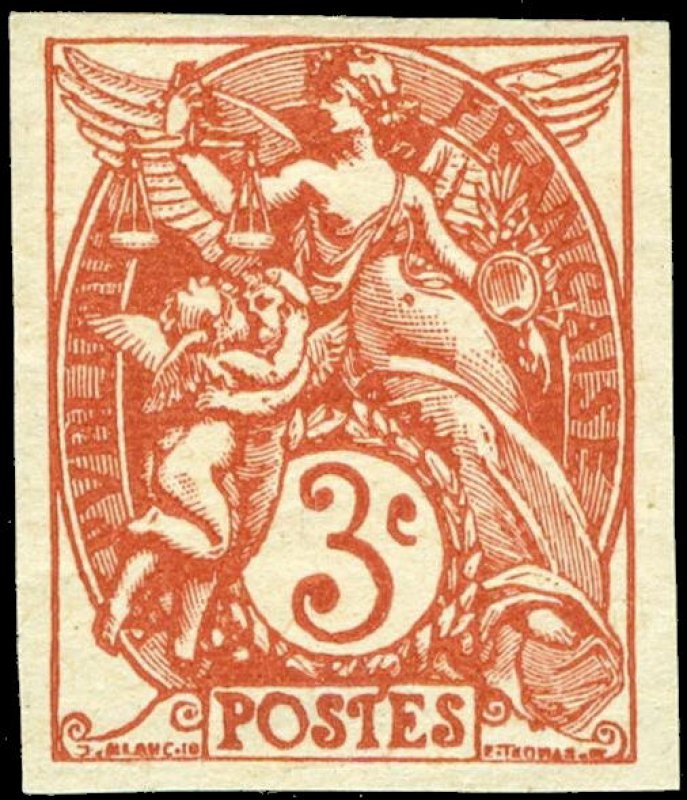 | Commentaire | Blanc. Type I. Timbre erroné, le R entre les jambes de l'ange est à l'envers En savoir plus sur Wikipédia : Type Blanc Mis en vente le 4 décembre 1900, le timbre Type Blanc de 3 centimes orange est l’une des premières valeurs de la nouvelle série d’usage courant conçue pour remplacer progressivement les types Sage. Réservé aux petits affranchissements (imprimés légers et compléments de port), ce 3 c inaugurait l’usage des valeurs basses du Type Blanc, dessiné par Joseph Blanc et gravé par Émile Thomas. La nuance orange, typique des premiers tirages de 1900, peut varier légèrement selon les bains d’encrage. En oblitéré, les cachets à date ordinaires dominent, tandis que les fragments et plis d’imprimés affranchis à 3 centimes constituent les documents postaux les plus représentatifs de cette valeur dans les timbres courants français du début du XXᵉ siècle. Ce timbre existe uniquement en impression typographique à plat pour les tirages initiaux ; les impressions en typographie rotative n’apparaîtront qu’à partir de 1930. Le Type Blanc, utilisé jusqu’en 1932, marque une étape importante entre les séries classiques et les émissions modernes. |