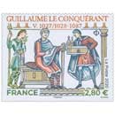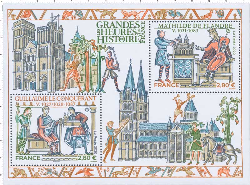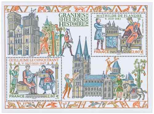 | Commentaire | Le bloc-feuillet évoque le destin de Guillaume le Conquérant (ou Guiullaume le Bâtard, Falaise 1027/28 -- Rouen 9 sept.1087), duc de Normandie, qui au XIe siècle s’empara du trône d’Angleterre, et de son épouse Mathilde de Flandre (v.1031 - Caen 2 nov.1083), qui joua un rôle capital à ses côtés. Guillaume est le fils de Robert le Magnifique (Robert 1er de Normandie, v.1010 - juil.1035) et d’Arlette de Falaise (v.1010 - v.1050), la concubine de celui-ci. Le jeune duc, âgé de 23 ans, voulant rompre avec les traditions Vikings, décide de choisir personnellement une femme dans les cours d'Europe et jette son dévolu sur Mathilde, la fille du comte Baudouin V de Flandre, âgée de 18 ans et descendant de la lignée de Charlemagne et des Capétiens. Passant outre le refus du pape Léon IX (pontificat déc.1048 - avril 1054), les deux jeunes gens se marient vers 1050/51. Mathilde ne sera pas, uniquement la mère des huit enfants de Guillaume le Conquérant, elle aura un véritable rôle politique à ses côtés, lui donnant son avis, le conseillant. Aussi, après la célèbre bataille d'Hastings (14 oct.1066) et sa conquête du trône d'Angleterre (couronné le 25 déc.1066), souhaite-t-il l’associer officiellement à son triomphe. En 1068, il la fait venir à Londres pour qu’elle soit sa reine. Mathilde décède en nov.1083 et Guillaume dévasté par le chagrin, s’éteindra, moins de quatre ans après le décès de celle qui fut l’amour de sa vie. En savoir plus sur Wikipédia : Guillaume le conquérant |