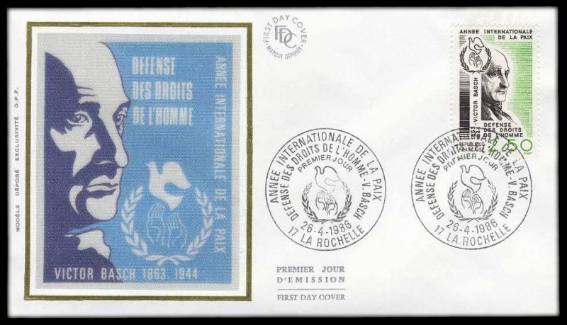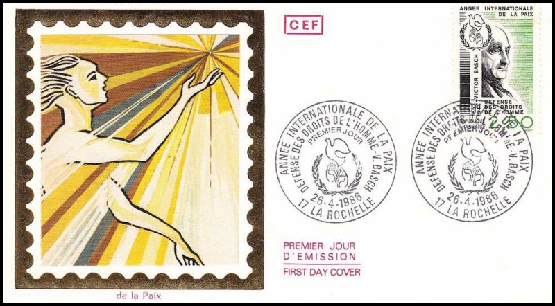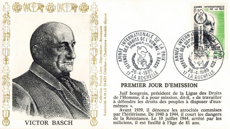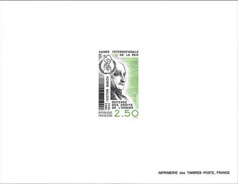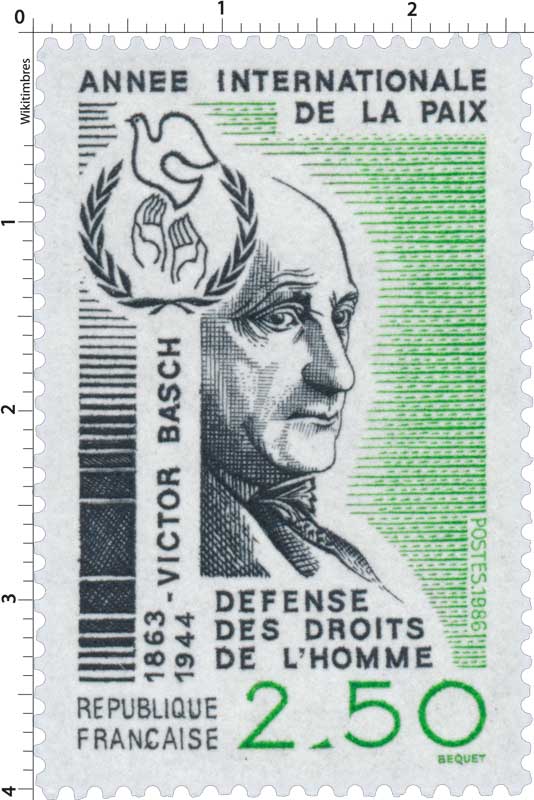 | Commentaire | Le timbre-poste consacré à l'Année Internationale de la Paix associe l'emblème officiel retenu par les Nations Unies et le visage de l'humaniste français Victor Basch qui, durant toute son existence, n'a cessé d 'œuvrer pour que l'harmonie règne entre les hommes. Victime lui-même de la guerre, il est mort en défendant jusqu'au sacrifice suprême l'idéal de toute sa vie.