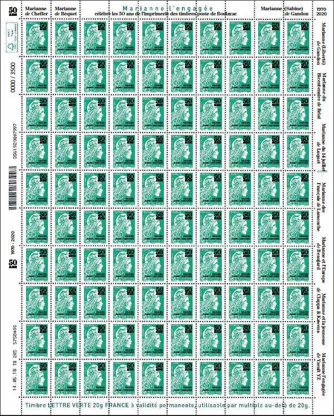 | Commentaire | Voir la vidéo "Histoires de timbres" Chaque feuille est surchargée, sur les timbres et les marges. elles sont numérotées de 1 à 3.500 en marge gauche au niveua de la 3ème rangée horizontale. Sur les contours sont listés les noms des Marianne réalisées à l’Imprimerie de Boulazac depuis 1970 ainsi que les noms de leurs créateurs.