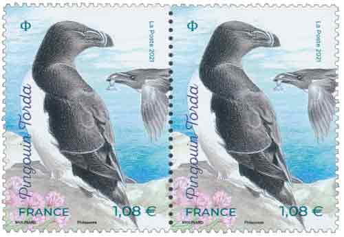 | Commentaire | Pingouin Torda : Philippe Clément /Belpress / Andia Le Pingouin Torda (Alca torda) ou petit pingouin, est de la famille des alcidés. Seul pingouin subsistant depuis la disparition du grand pingouin vers 1844, il est présent en Manche et de l’Atlantique Nord à la mer de Barents. Les adultes sont noirs sur le dos et blancs sur le ventre, la poitrine est brun-noir. Le bec est de couleur noire, et porte une à plusieurs rayures transversales grises et une rayure transversale blanche ;la commissure des lèvres est jaune. Une autre rayure blanche part de la base du bec et s’allonge longitudinalement jusqu'à l’œil, qui est de couleur noire. Une rayure blanche traverse aussi le bout des ailes. En hiver, leur tête devient blanche. Ils mesurent de 39 à 48 cm, pour un poids moyen de 700 gr., et ont une envergure de 60 à 69 cm. Ils peuvent voler, mais ne peuvent guère marcher sur leurs pattes, qui reposent sur leurs tarses et sont placées très en arrière du tronc, ce qui n'est pas adapté à la locomotion terrestre. Leur durée de vie moyenne est de 20 ans. Pour leur alimentation, installé en surplomb de la mer, ils se laissent tomber en voletant pour aller pêcher sous l’eau des poissons comme le lançon, le hareng et le capelan, mais également des crustacés et parfois des vers marins. En savoir plus sur Wikipédia : Petit Pingouin |