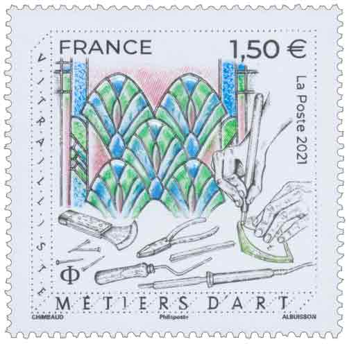 | Commentaire | Visuel : le timbre évoque la conception et la réalisation d'un vitrail coloré, avec la panoplie d'outillages nécessaires au Vitrailliste, ou Maître verrier, créateur de ces vitraux pour un édifice sacré ou profane et cela depuis le Moyen-âge. Le vitrailliste (ou maître-verrier) est un artisan d'art, qui assemble au plomb, des verres plats, colorés ou non, et parfois enrichis de motifs peints appelés grisailles. Il peut également réaliser des dalles de verre ou utiliser des méthodes de fusing (fusion à haute température) associant différents verres de couleur sans le charme du plomb. Il est le maître des couleurs et de la lumière et met en œuvre la création de tableaux en verre ou la restauration de vitraux d'édifices religieux depuis le moyen-âge. |