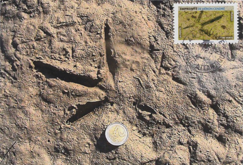 | Commentaire | Empreinte de héron cendré © Jean-François Cart / Naturagency Le héron cendré (Ardea cinerea) est une espèce d'oiseaux échassiers de la famille des Ardéidés. Il se caractérise par un long cou, un long bec pointu et de longues pattes. Il vit le plus souvent dans les marais ou sur le bord des étangs. Leur empreinte se rencontre souvent sur les vasières, elle est formée de quatre traits ponctués de griffes apparentes correspondant aux trois longs doigts antérieurs et au pouce très développé et un peu décalé par rapport au doigt médian. |