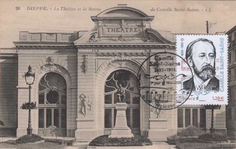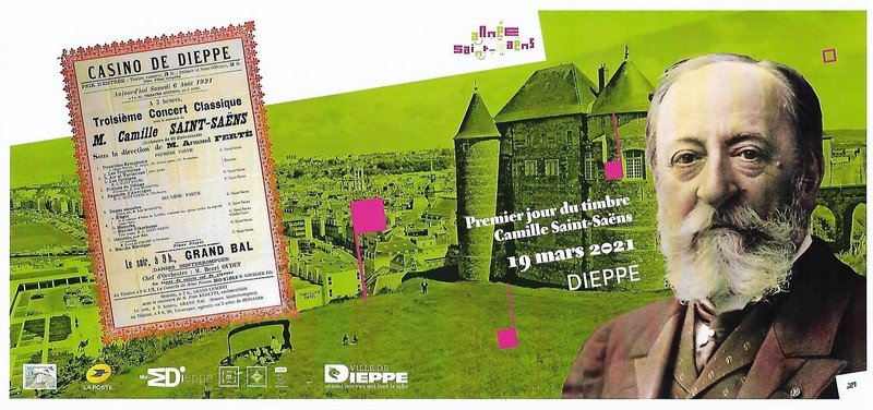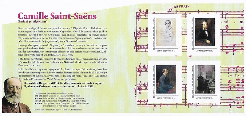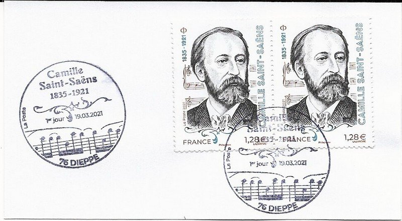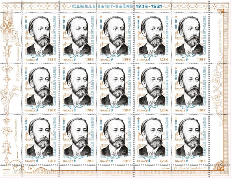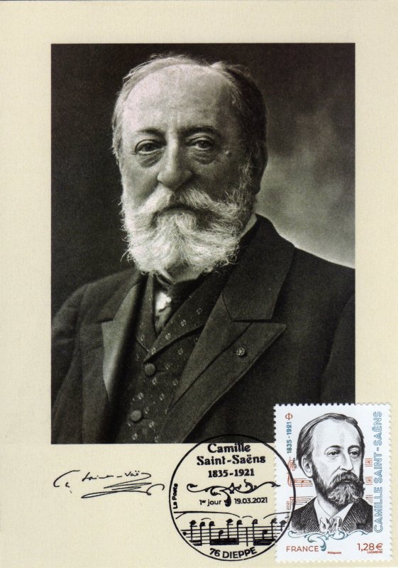 | Description | Émission d'un timbre pour le centenaire de la mort de Camille Saint-Saëns, pianiste, organiste et compositeur français, né à Paris |