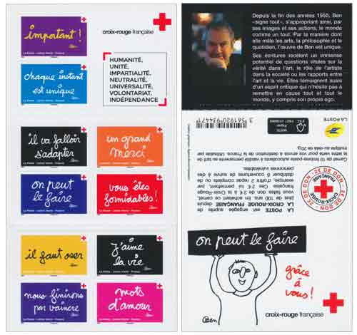 | Commentaire | Ce carnet est grevé d'une surtaxe de 2,00 € de don à la Croix-Rouge. L'art et la manière de Benjamin VAUTIER, dit Ben (né à Naples, Italie, le 18 juil.1935, Suisse et français), de faire circuler sa peinture et sa pensée, mais également, de façon plus discrète, sa générosité. Pour Ben, il était impossible d'hésiter. Tous concernés : "Par les temps qui courent, avoir besoin d'un repas, cela peut arriver à chacun d'entre nous". Alors, il a imaginé quelques messages et tous font mouche. Deux slogans, "Il va falloir s'adapter" et "Nous finirons par vaincre", résonnent comme un pied-de-nez à la pandémie. "J'aime la vie", écrit encore Ben à qui la Poste et la Croix- Rouge française retournent "Un grand merci". Son œuvre intègre des univers éloignés du champ artistique, comme l'ethnisme (définit la nation comme une communauté linguistique), l'ego (représentation et conscience de soi-même) ou la vérité. Ses "écritures", qui allient impertinence et justesse de propos, bénéficient d'une grande popularité. En 1949, après la Seconde Guerre mondiale, avec sa mère, il s'installe à Nice et en quelques années, avec l'aide de sa mère, il ouvre une boutique de disques d'occasion dont il transforme la façade en accumulant quantités d'objets, et devient un lieu de rencontres et d’expositions où se retrouvent les principaux membres de ce qui deviendra l'Ecole de Nice : César Baldaccini, dit César (1921-1998, sculpteur), Ben en 2013 Armand Fernandez, dit Arman (1928-2005, peintre, sculpteur, illustrateur et artiste), Martial Raysse (1936, peintre, sculpteur et réalisateur) et bien d'autres.