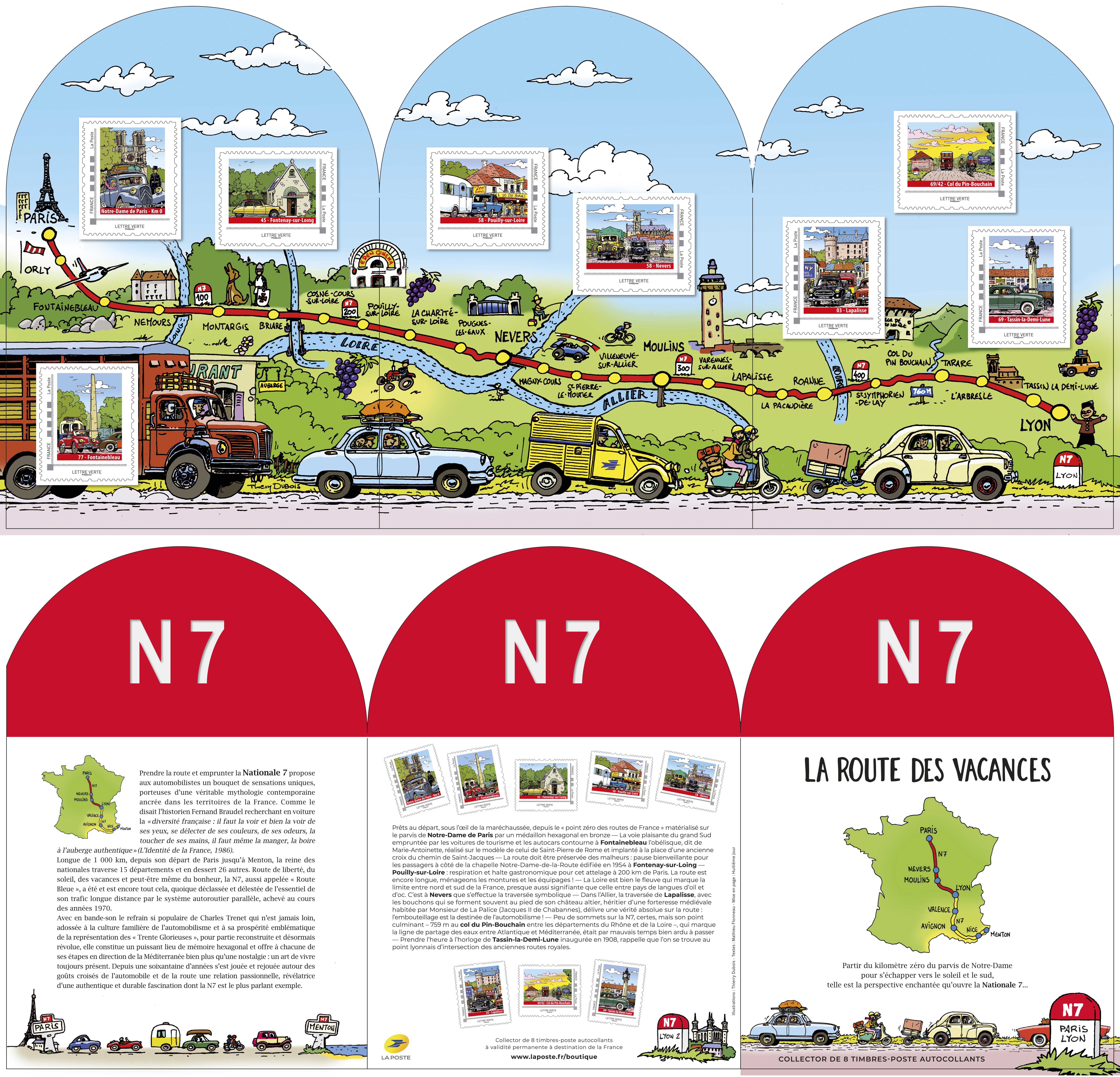 | Commentaire | C'est en 1824 que la Route impériale n°8, appellation depuis Napoléon, devient la Route royale n°7, soit un itinéraire allant de Paris à la ville d'Antibes ; et en Italie, par Nice. C'est sous la Troisième République (du 4 sept.1870 au 10 juil.1940) en pleine révolution industrielle, qu'elle devient la "Route nationale 7". C'est la fameuse "Route des vacances" la "N7" (ou "Route Bleue") est un grand témoin de l'histoire, depuis les Romains, de nombreux tronçons de cette voie ont été traversés par les seigneurs, les rois où les armées. Elle a traversé les événements et incarne aujourd'hui un haut lieu symbolique pour l'automobile. Depuis la Porte d'Italie jusqu'à Menton, elle s'étire et serpente sur 1000 km. En savoir plus sur Wikipédia : Route national 7 Dépliant 3 volets, format ouvert 445 x 210 mm et fermé 150 x 210 mm |