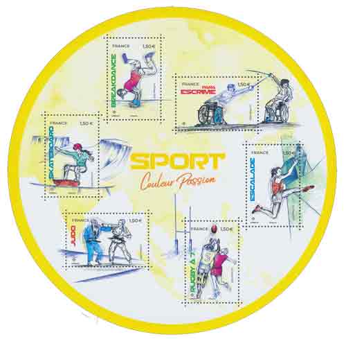 | Description | Émission d'un bloc rond de 6 timbres dans la série sport. Les 6 disciplines sportives misent à l’honneur cette année sont : JUDO / RUGBY À 7 / ESCALADE / PARA-ESCRIME / BREAKDANCE / SKATEBOARD |