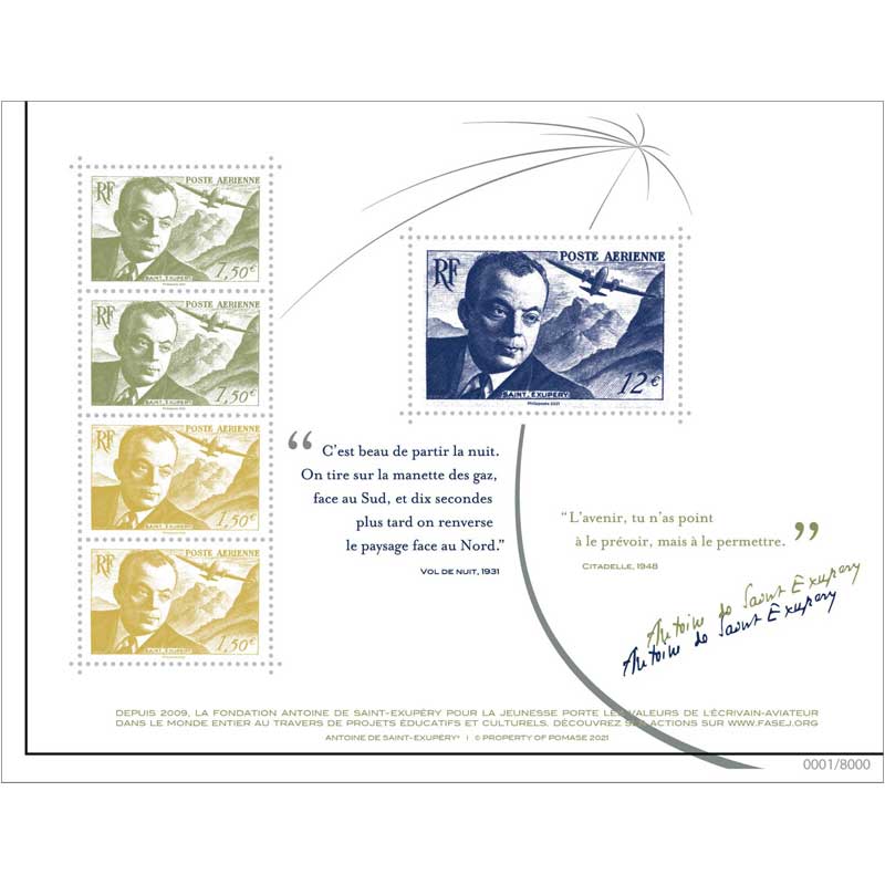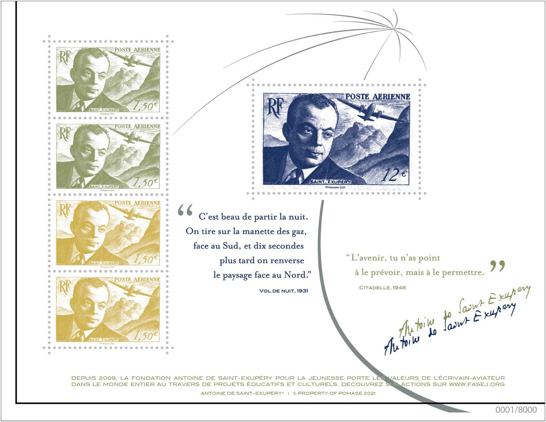 À l’occasion du 75e anniversaire de la parution de la première édition française "Le Petit Prince", Philaposte réédite le timbre "Antoine de Saint-Exupéry" de 1948 pour une création d’exception. Le bloc reprend le timbre cinq fois dont une version agrandie.