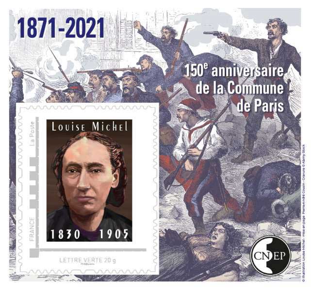 | Commentaire | Dans le cadre du 150e anniversaire des événements de la Commune de Paris, notre partenaire la C.N.E.P. la Chambre syndicale française des Négociants et Experts en Philatélie, édite un nouveau bloc le 28 mai 2021 rendant hommage à Louise Michel (1830-1905). Clémence-Louise Michel, dite Louise Michel, institutrice sans affectation (ayant refusée de prêter serment à Napoléon III) est une figure révolutionnaire et anarchiste de premier ordre dans l’imaginaire collectif. Arrivée à Paris en 1856, elle enseigne à l'école libre et développe parallèlement une importante activité littéraire et politique, entretenant une correspondance assidue avec Victor Hugo, en lui adressant ses poèmes. Elle les signe sous le pseudonyme d’Enjolras qui est le nom du chef révolutionnaire dans "Les Misérables" (1862), comme si elle s’identifiait à ce célèbre activiste de fiction. Elle se lie avec plusieurs personnalités révolutionnaires blanquistes de Paris (Louis Auguste Blanqui, dit "l'Enfermé" 1805-1881, philosophe, homme politique, journaliste et communard) des années 1860. En 1871, elle participe activement aux événements de la Commune de Paris, autant en première ligne qu'en soutien. S'étant livrée en mai pour faire libérer sa mère, elle est déportée en Nouvelle-Calédonie où elle se convertit à la pensée anarchiste. Elle revient en Métropole en 1880, et, très populaire, multiplie les manifestations et réunions en faveur des prolétaires (classe sociale). Elle reste surveillée par la police et est emprisonnée à plusieurs reprises, mais poursuit son militantisme politique dans tout le pays, jusqu'à son décès. En savoir plus sur Wikipédia : Louise Michel |