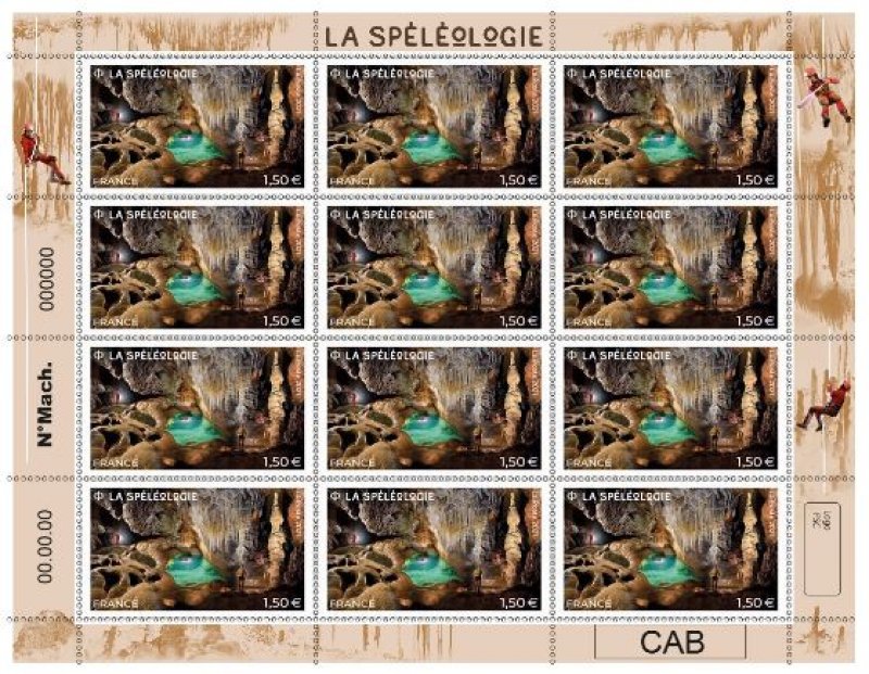 | Commentaire | En savoir plus Wikipédia : Spéléologie Trois cavités différentes illustrent le timbre, gours (salle des gours, cavité Aven de Rose - Hérault), étendue d’eau et stalagmite (Lac de Minuit et Grande stalagmite, grotte de Trabuc - Gard), fistuleuses (visibles et communes à de nombreuses cavités, ici grotte de Pousselières - Hérault). Les hommes ont fréquenté les grottes depuis la préhistoire, pour le refuge qu’elles leur offraient. La spéléologie, activité sportive de pleine nature, permet une exploration technique et scientifique des cavernes, gouffres, cavités souterraines diverses, avec une étude des eaux, de la flore, de la faune, de l'archéologie préhistorique, etc.. Cette activité offre plusieurs variantes, la spéléologie aux techniques sportives et la spéléologie scientifique, subdivisée en spéléologie physique, en biospéléologie, en archéologie souterraine, etc… Les spéléologues ne limitent pas leur exploration à la topographie des galeries et à ses éventuelles applications, ils communiquent aux spécialistes, géologues, préhistoriens, zoologistes, leurs observations, parfois exceptionnelles : peintures préhistoriques, présence de minerais, et ils guident sur place les chercheurs intéressés. La curiosité de certains scientifiques pour le milieu souterrain a commencé à exister à partir du XVIIIe siècle, jusqu’à Édouard- Alfred Martel (1859-1938, avocat, spéléologue, géographe et cartographe) père fondateur de la spéléologie moderne en 1888. |