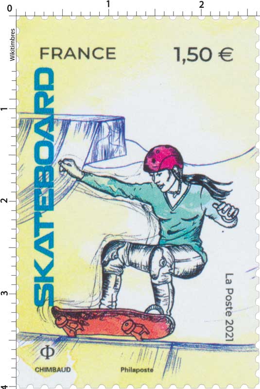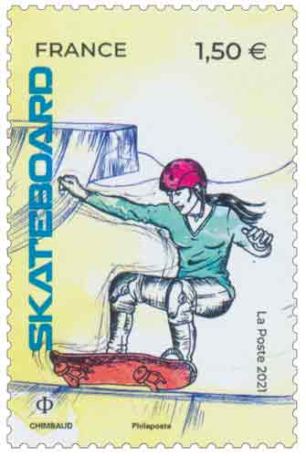 | Commentaire | Skateboard féminin (ou planche à roulettes) - pour se déplacer ou réaliser des figures acrobatiques. Apparue aux États-Unis dans les années 1950, la pratique du skateboard est devenue un phénomène culturel mondial. Sport olympique à l’occasion des Jeux de Tokyo, les épreuves se dérouleront selon deux disciplines : le street, sur un parcours ayant l’aspect d’une rue avec escaliers, rampes, bordures et murs… La rampe (ou park) combine un "bowl" et une variété de courbes complexes. Des hauteurs vertigineuses sont atteintes en décollant des bowls et en exécutant de spectaculaires figures dans les airs. En France, la discipline dépend de la Fédération Française de Roller et Skateboard. |