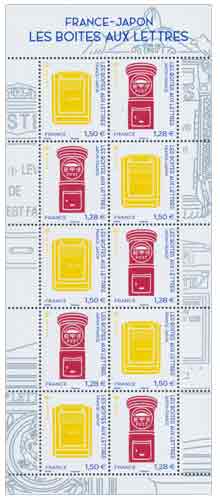 | Description | Dans le cadre de la Saison de la France au Japon, les Postes françaises et japonaises émettent chacune un bloc feuillet de timbres illustré par des boîtes aux lettres françaises et japonaises |