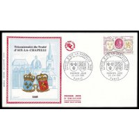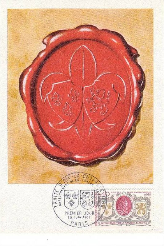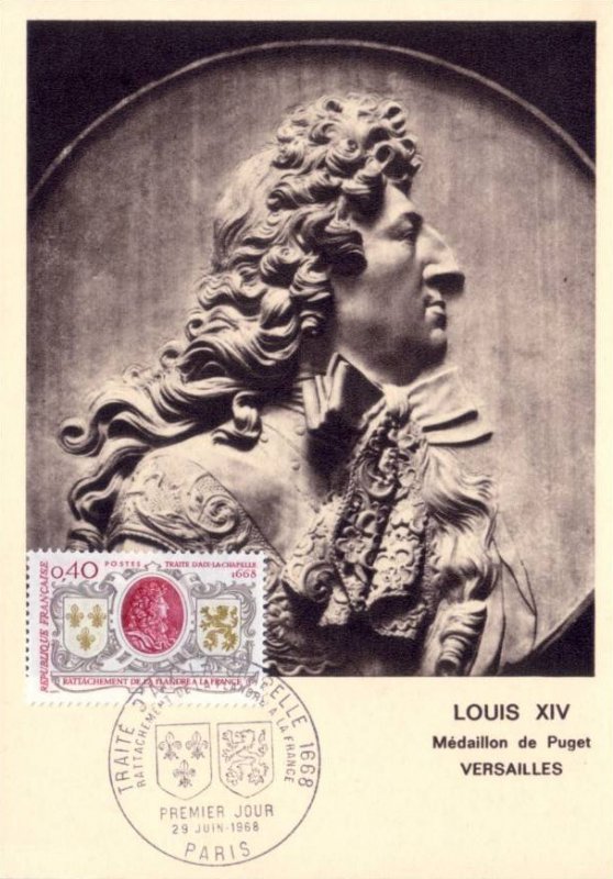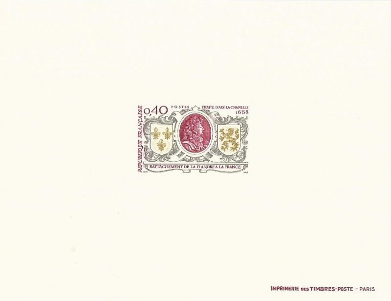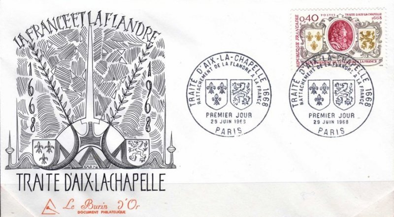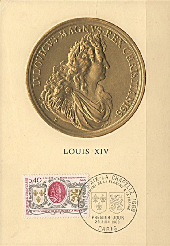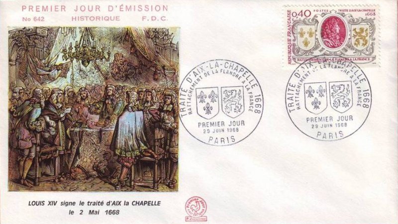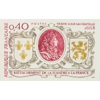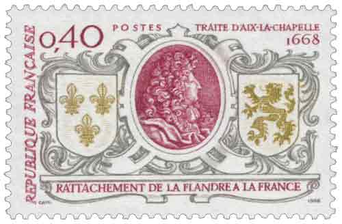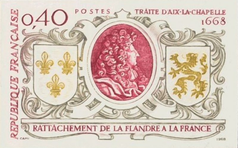 | Commentaire | En savoir plus sur Wikipédia : Traité d'Aix-la-Chapelle (1668) Parmi les grandes manœuvres politiques du règne de Louis XIV, le traité d’Aix-la-Chapelle de 1668 occupe une place charnière. Pas tant par la guerre – brève – que par la façon habile dont le Roi-Soleil y joua ses cartes. Imaginez un jeune roi, décidé à imposer sa vision, réclamant sa part d’un héritage espagnol avant même le décès du roi en titre… tout cela sur fond de droit féodal brabançon et de clauses de mariage impayées. Oui, vraiment, du Louis XIV dans toute sa splendeur. Ce que Louis veut alors, ce sont les riches provinces des Pays-Bas espagnols, et pour cela il invoque un vieux droit régional – le « droit de dévolution » – qui avantage les enfants du premier mariage… ce qui tombe bien, puisque son épouse Marie-Thérèse est justement concernée. La France lance donc ses armées à l’été 1667 : Lille, Douai, Tournai tombent les unes après les autres. La Franche-Comté aussi, en un éclair. Mais voilà que la Triple-Alliance – Suède, Hollande, Angleterre – s’en mêle. Inquiets de voir Louis XIV trop proche, les voisins veulent calmer le jeu. Le roi, malin, leur souffle une idée : forcer l’Espagne à choisir entre les terres conquises. Elle opte pour la Franche-Comté, et Louis garde… la Flandre. Douze places fortes verrouillent désormais le nord du royaume. Et pour marquer le coup, il commande à Vauban une citadelle à Lille – la première pierre de sa fameuse « barrière de fer ». Ce traité n’est pas qu’une signature : il scelle une stratégie, amorce un grignotage méthodique du territoire qui ne s’arrêtera pas là. Il témoigne aussi d’un art consommé de la diplomatie, entre force militaire et habileté juridique. Bref, quand Louis XIV bâtit la France moderne, ce n’est pas qu’avec des batailles. C’est aussi avec des paragraphes bien ficelés. WikiTimbres |