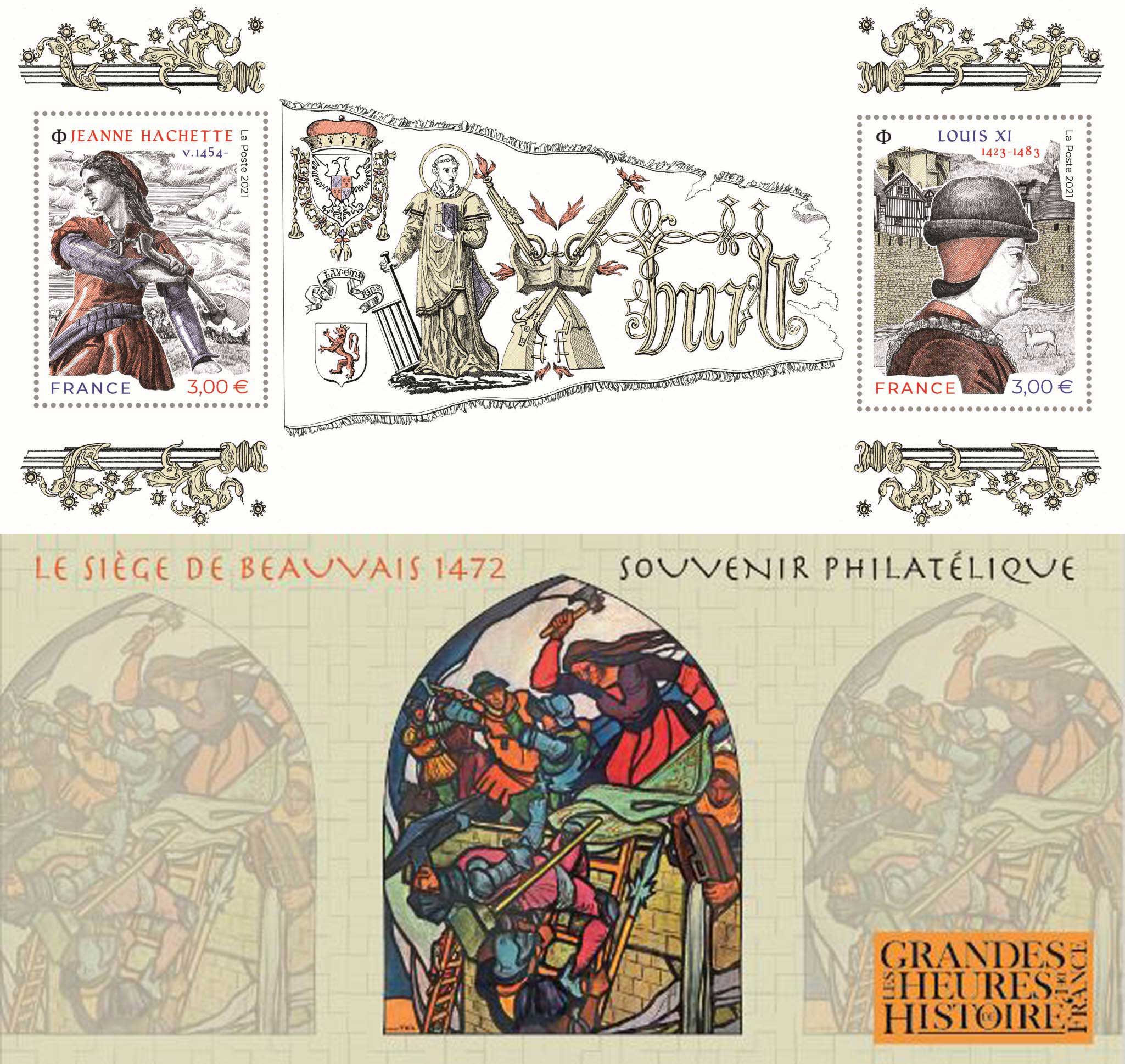 | Description | Souvenir philatélique dans la série "LES GRANDES HEURES DE L’HISTOIRE DE FRANCE " - Jeanne Hachette v.1454 – Louis XI 1423-1483 |