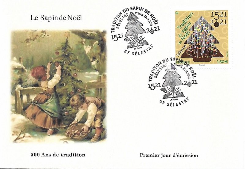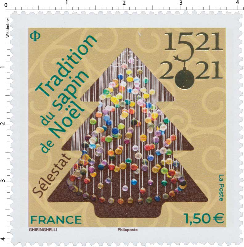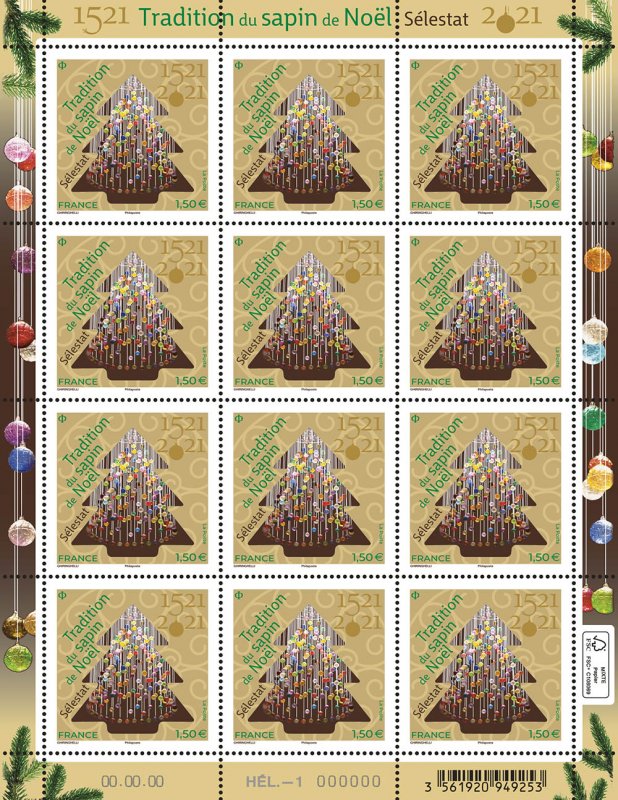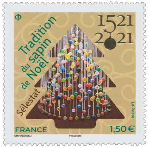 | Description | Émission d'un timbre qui célèbre les 500 ans de l'inscription de la mention du premier Sapin de noël dans les livres de la commune de Sélestat. |