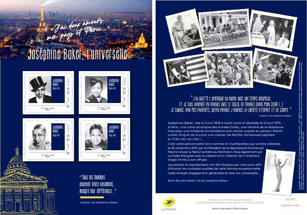 | Description | Collector de 4 timbres à l’effigie de Joséphine Baker à l’occasion de son entrée au Panthéon |