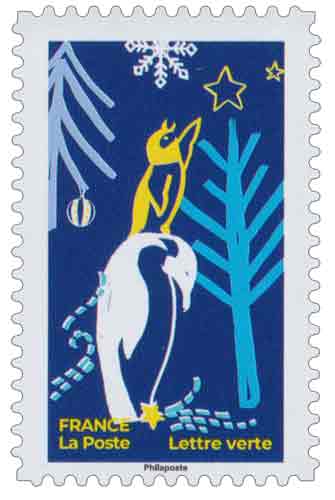 | Commentaire | Un manchot Empereur et son oisillon, pointant l'une de ses ailes vers une étoile (oiseaux endémiques de l'Antarctique), des empreintes, un arbre dénudé et un sapin avec une boule de Noël, un cristal de neige et des étoiles. |