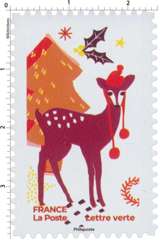 | Commentaire | Un faon coiffé d'un bonnet d'hiver, des empreintes, un sapin, des étoiles, du houx (symbole de la protection et de l'immortalité). |