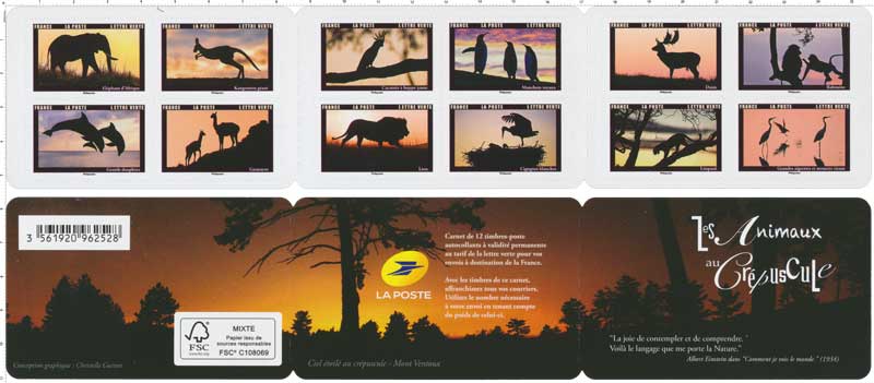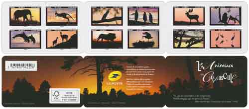 | Description | Carnet de 12 timbres prioritaires sur le thème de photos d'animaux au soleil couchant |